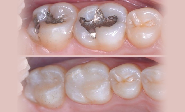Light cured fully esthetic fillings made by layers that each can be done with different color. Titanium pins are used for weak teeth.